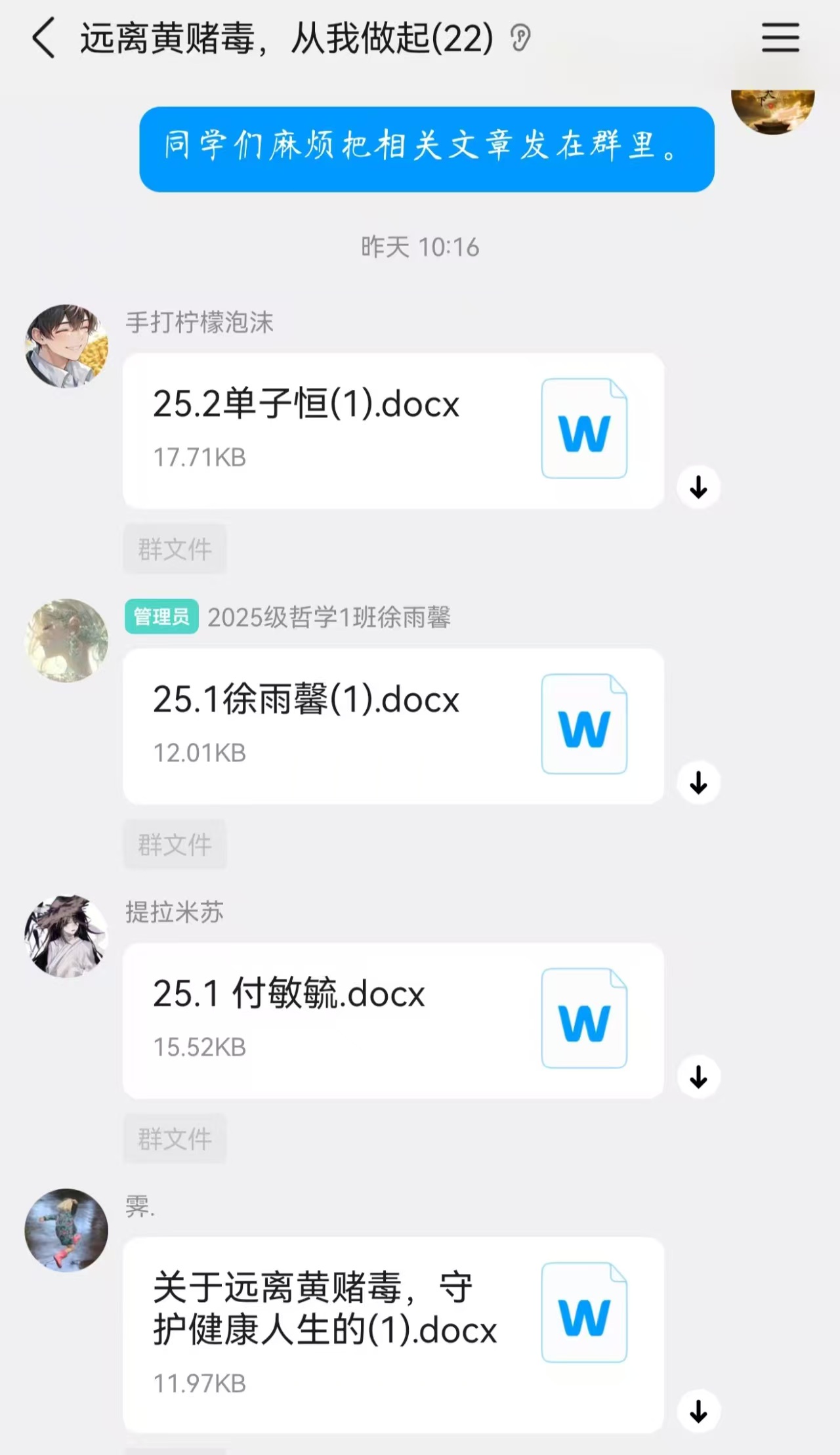 活动负责人耿孝棣以“认清危害、守牢底线”为切入点,点明此次征文活动的活动目的和活动内容。耿孝棣指出,“黄赌毒”行为会严重损害大学生的身心健康,新时代大学生应坚决远离并抵制这些不良诱惑,树立正确的价值观和法治观,从身边小事做起,自觉远离不良风气,守护自己的美好青春。参与者在活动过程中积极投稿、踊跃参与,以文章形式展现出对“黄赌毒”问题的关注与思考,共同书写对健康青春、纯净校园的承诺与守护,为自己、为同学、为社会传递一份清醒而有力的青年声音。参与者徐雨馨表示,此次活动形式新颖,使自己对“黄赌毒”的危害有了更清晰的认知,今后会时刻保持警惕,从自身做起,远离“黄赌毒”不良风气,同时主动向身边人宣传相关知识,共同营造风清气正的成长环境。