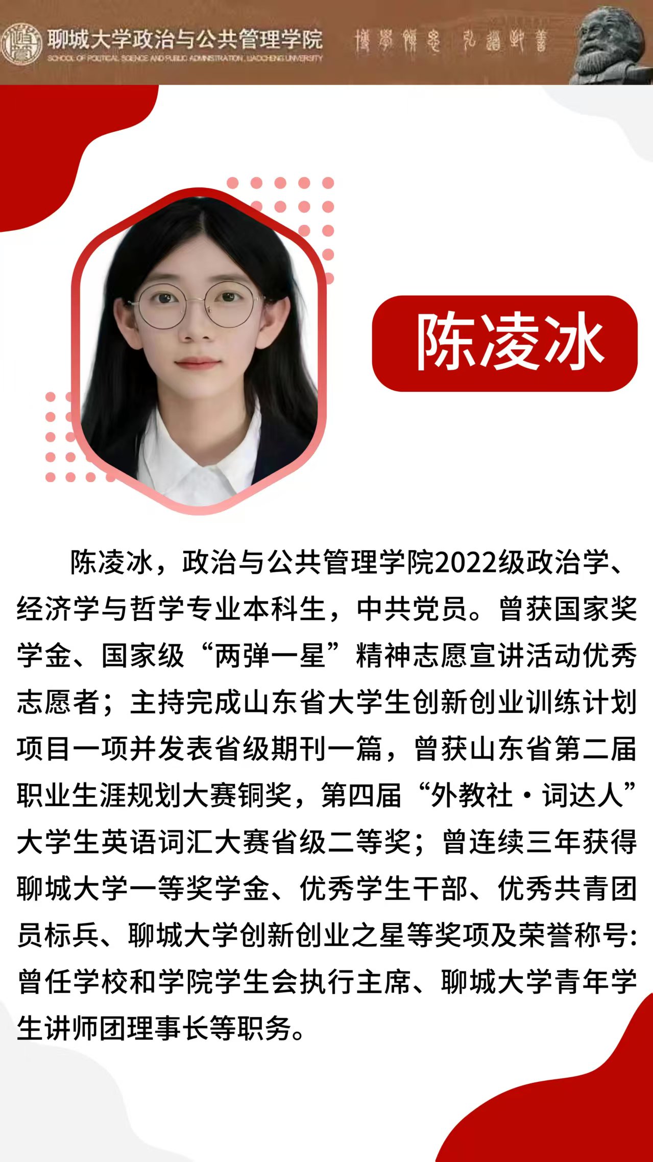 陈凌冰,优游ub82022级政治学、经济学与哲学专业本科生,中共党员。她以“勤学”为青春底色,专注专业学习、瞄准能力提升,连续三年斩获优游国际一等奖学金、国家奖学金,用努力诠释了“以学为先”的价值导向。在她的带动下,班级形成了比学赶超的浓厚氛围,同学们主动交流学习心得、共同攻克学业难题,让“勤学”不再是口号,而是融入日常的行动 。她始终践行“知行合一”的理念:将专业知识与社会实践紧密结合,主持完成山东省大学生创新创业训练计划项目1项,相关成果发表于省级期刊;在学科竞赛中屡获佳绩,拿下山东省第二届职业生涯规划大赛铜奖、第四届“外教社·词达人”大学生英语词汇大赛省级二等奖,用实践让知识落地、让能力进阶。