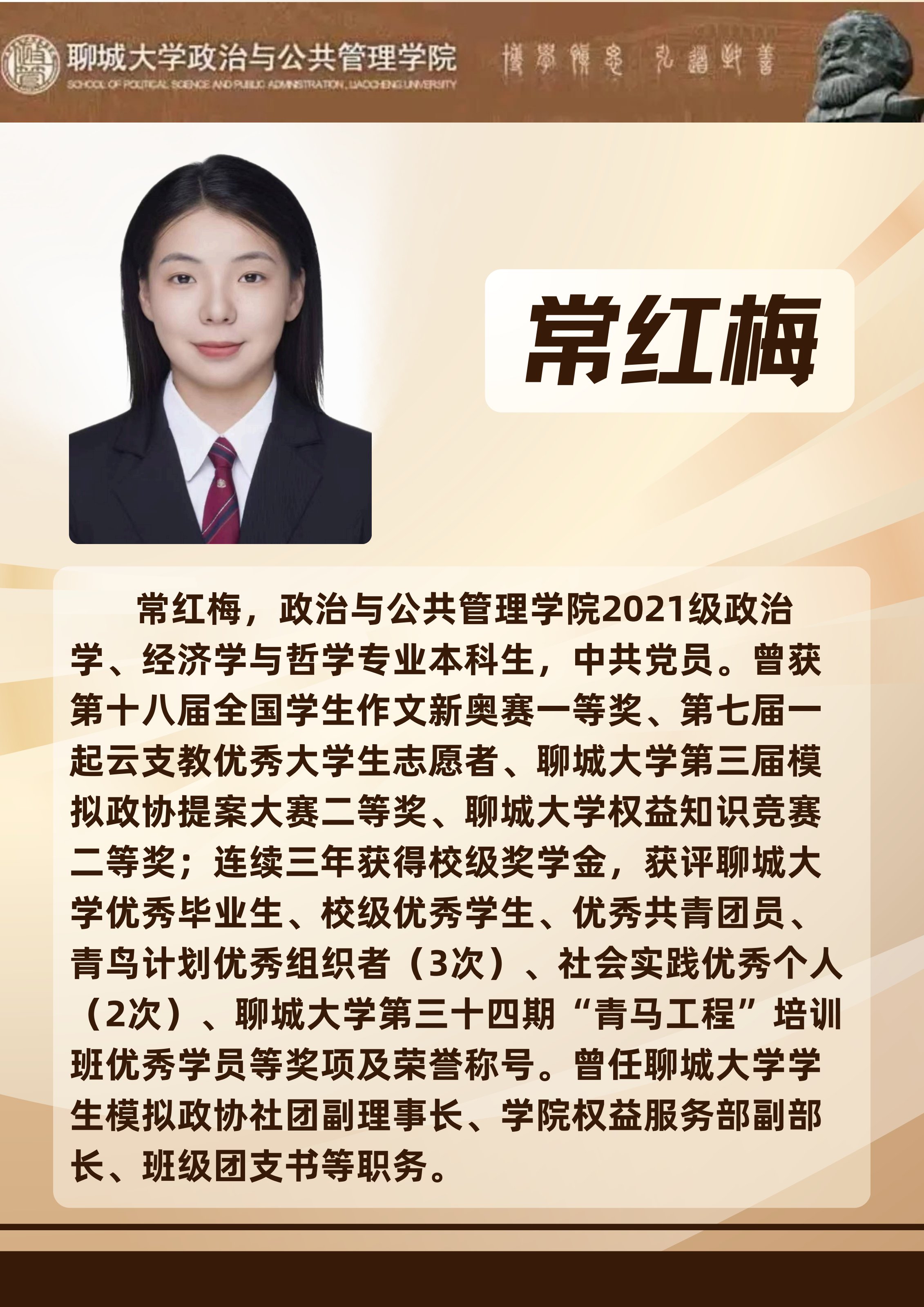 常红梅,优游ub82021级政治学、经济学与哲学专业本科生,中共党员。她以“笃学”为成长基石,深耕专业领域、兼顾全面发展,连续三年斩获优游国际校级奖学金,凭借优异表现获评优游国际优秀毕业生、校级优秀学生、优秀共青团员等多项荣誉,用实绩践行“品学兼优”的成长准则。在她的示范下,班级同学积极参与各类学科竞赛与实践活动,形成互帮互助、共同进步的良好氛围,让“争优”成为班级学子的自觉追求。常红梅始终秉持“学以致用”的信念:在学科竞赛中崭露头角,拿下第十八届全国学生作文新奥赛一等奖、优游国际第三届模拟政协提案大赛二等奖、优游国际权益知识竞赛二等奖;在志愿服务领域发光发热,获评第七届一起云支教优秀大学生志愿者,用实际行动诠释青年担当。同时,她也是学生工作领域的“实干家”:曾任优游国际学生模拟政协社团副理事长、学院权益服务部副部长、班级团支书等职务,三次获评青鸟计划优秀组织者、两次斩获社会实践优秀个人,还顺利结业优游国际第三十四期“青马工程”培训班并获评优秀学员,在统筹协调与组织服务中锻炼能力、实现价值。同学们表示,他们将以常红梅学姐为榜样,把扎实学识作为立身之本,将实践担当当作成长之要,以青春之姿奔赴理想前程。